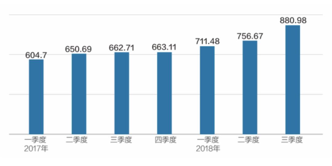 2017年第一季度~2018年第三季度我国信用卡逾期半年未偿信贷总额(单位:亿元)