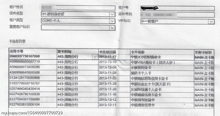 我就把我(名下)所有卡号还有征信都打印了出来,然后发现所有的卡都不是我办的,包括征信记录上留的信息也不是我的,当然名字是我的,身份证号是我的,现住地址、电话都不是我自己的。