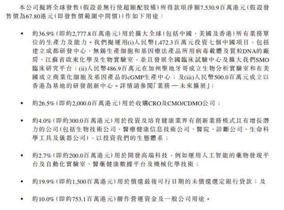 在A股市场上无法募集到足够资金的药明康德决定走出国门,到香港市场上筹集更多的钱。在本次H股的招股说明书里,本次募集资金最多83.3亿港元,主要用于一下几个方面: