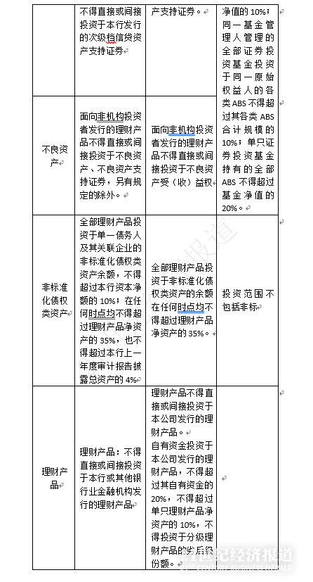 (7)对于信贷资产、不良资产及其ABS、受(收)益权,银行理财子公司有所收紧,不得直接投资于信贷资产,不得直接或间接投资于主要股东的信贷资产及其受(收)益权,而银行理财实则可投资于他行信贷资产受(收)益权。银行理财子公司的个人理财产品投资有所放松,不能投资于不良资产受(收)益权,但没有禁止投资不良资产、不良资产支持证券。