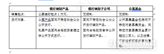 在资金募集方式上,公募理财方面,银行理财子公司与公募基金一只,对投资人无限制。私募产品均需按照资管新规规定。