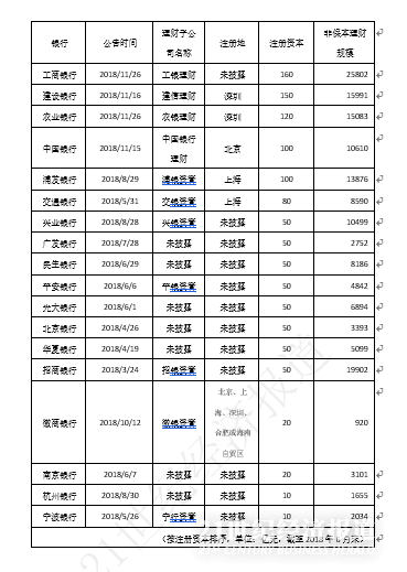=截至目前,包括五大行、八家股份制银行、五家城商行等18家银行已正式公布理财子公司成立方案,注册资本在10亿原-160亿不等,其中工行拟成立的理财子公司注册规模最大。