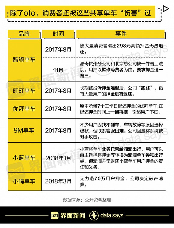 ofo并不是第一家“伤害”消费者的共享单车。从2017年开始,酷骑单车、町町单车等就接连被曝出押金难退事件。