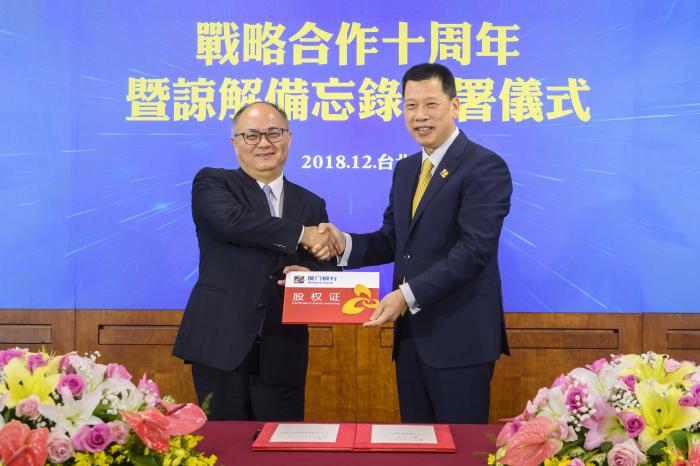 厦门银行董事长吴世群(右)代表厦门银行向富邦金控总经理韩蔚廷发放股权证