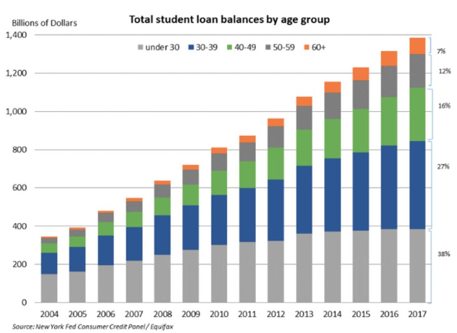 目前,4400万美国人正在背负着1.5万亿美元的学生贷款,这个数字较2007年增长了三倍,预计到2022年将会达到2万亿美元。根据布鲁金斯学会的预计,到2023年40%的学生贷款将会出现逾期。根据美国教育部的数据,在1995至1996年进入大学并申请学生贷款的人群中,至今只有一半人还清了所有贷款。
