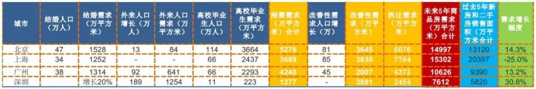 北京的高校毕业生在一线城市最高,为114万人,未来这部分高校毕业生的购房需求较大,为3664万平方米,以上三类需求加起来得到北京的未来5年刚需为5276万平方米。北京未来改善性人口增长为81万人,按照人均住房面积45平方米计算,改善性需求为3645万平方米,拆迁需求为6076万平方米,未来刚需需求+改善性需求+拆迁需求为14997万平方米,而北京过去5年商品房(商品住宅+二手房销售面积)销售面积为13120万平方米,未来5年北京的商品房潜在需求较过去5年还会有14.3%的增长。