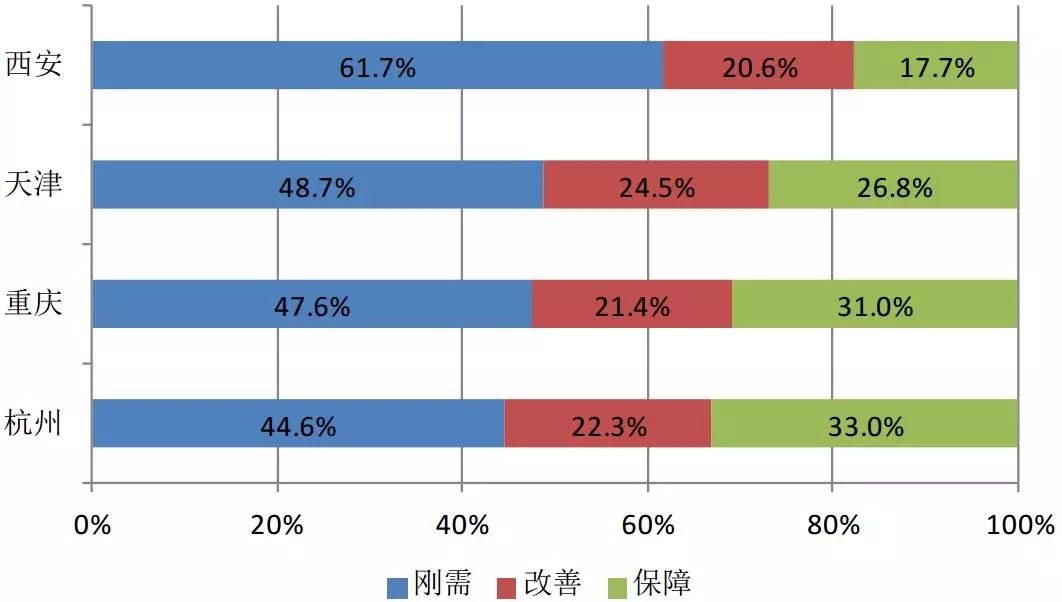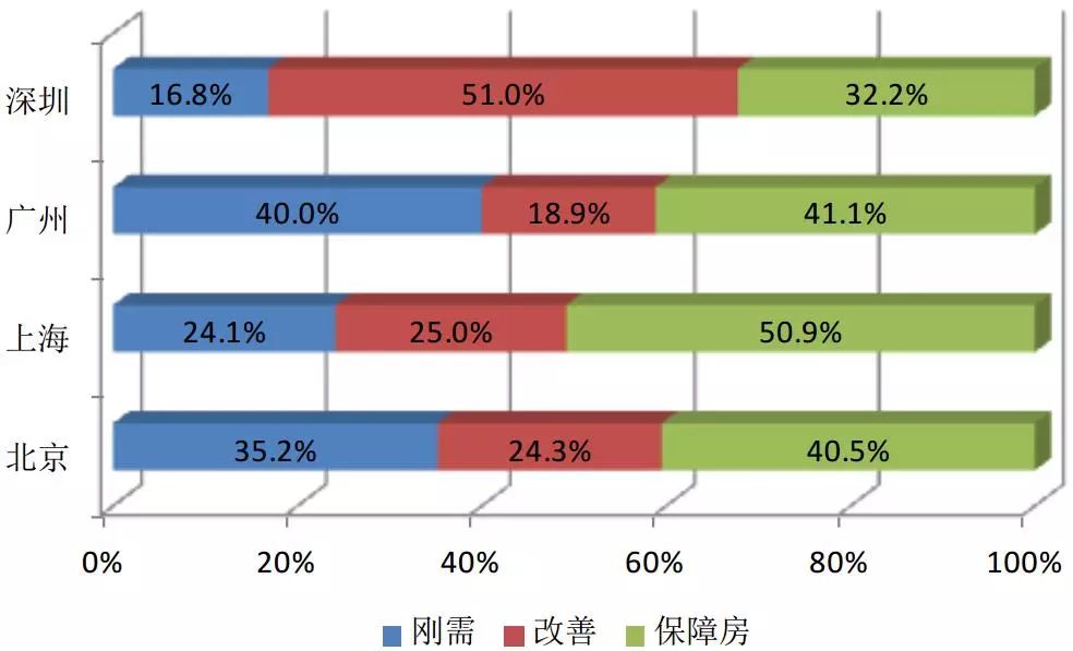 分城市的来看,北京的刚需较改善多,刚需、改善、保障房的比重为35:24:41. 上海的刚需和改善平分秋色,保障房比重很大,三类需求比重为24:25:51. 广州由于近年来有大量的外来人口,刚需需求占比为40%,改善19%,保障41%。 深圳由于人均住房面积较小,改善性需求较大,为51.0%,刚需为17%,保障为34%。