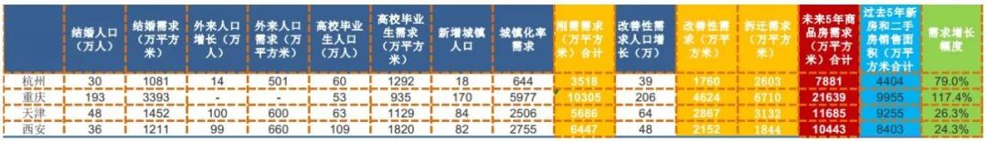 杭州未来5年的总商品房潜在需求为7881万平方米,较过去5年增长79%。重庆未来5年商品房潜在需求为21639万平方米,较过去5年增长117.4%。天津未来5年总需求为11685万平方米,较过去5年增长26.3%,西安的总需求为10443万平方米,较过去5年增长24.3%。