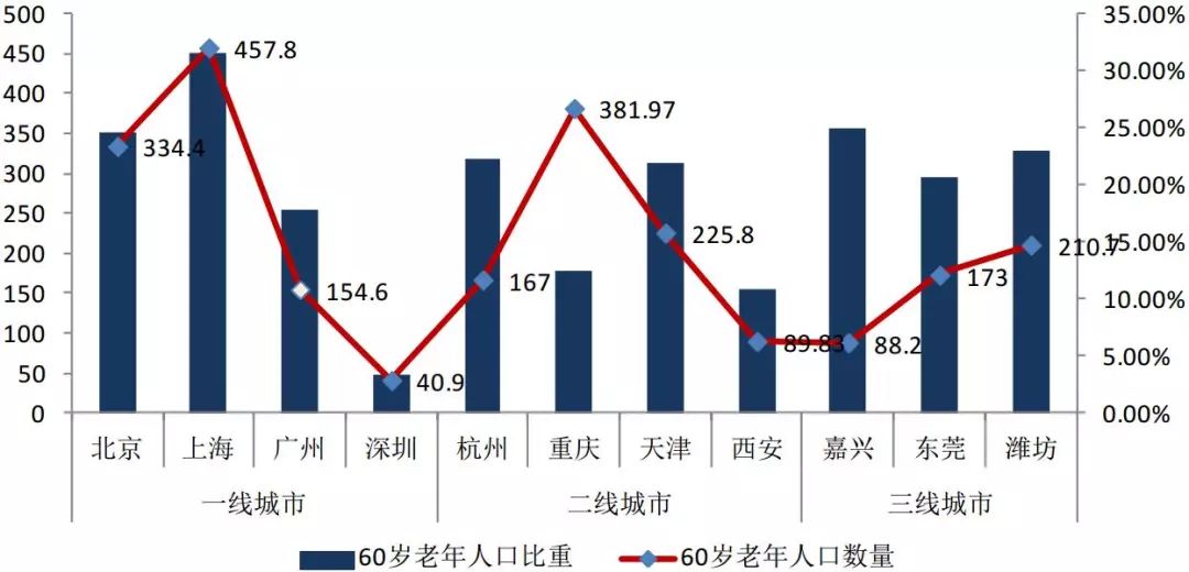 二线城市的老龄人口规模不及一线,但如杭州、天津等城市的老年人口比重也超20%,未来这2个城市的养老地产需求将保持增长。