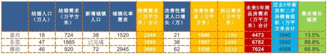 三线代表城市我们选择了长三角的嘉兴杭州、珠三角的东莞、环渤海的潍坊市。嘉兴杭州未来5年的总商品房潜在需求为4473万平方米,较过去5年增长13.5%。东莞未来5年商品房潜在需求为6782万平方米,较过去5年增长88.8%。潍坊未来5年总需求为7642万平方米,较过去5年增长66.9%。总体来说,三线城市需求分化,普通三线城市未来5年商品住宅需求增长10%左右,但城镇化大幅提高或者有大量外来人口的城市,住房需求增长在50%以上。