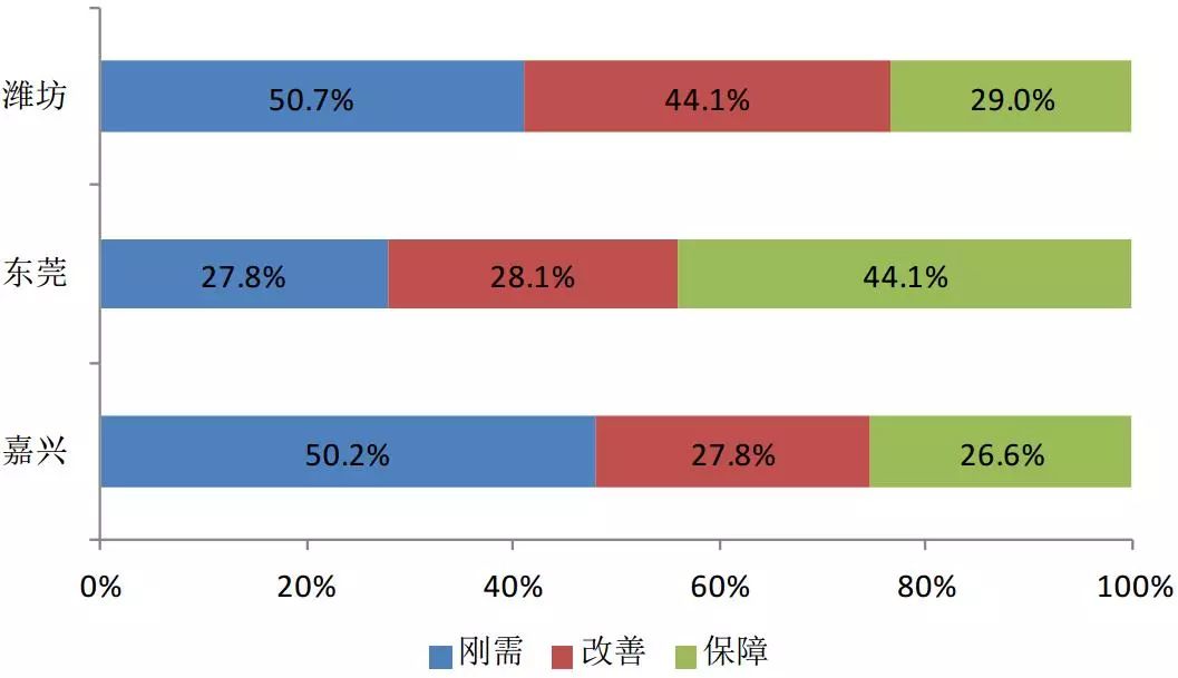 从三线代表城市刚需、改善、保障房需求的比重来看,三线城市平均水平为刚需、改善、保障房的比重为42:23:33。潍坊刚需、改善、保障的比重为50:44:29.东莞的刚需和改善平分秋色,三类比重为28:28:44. 嘉兴由于一线城市外溢需求较多,三类需求为50:28:27。