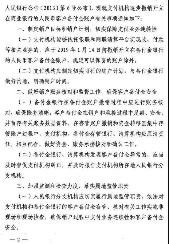 《备付金通知》提出,支付机构能够依托银联和网联清算平台实现收、付款等相关业务的,应于2019年1月14日前撤销开立在备付金银行的人民币客户备付金账户,规定可以保留的账户除外。