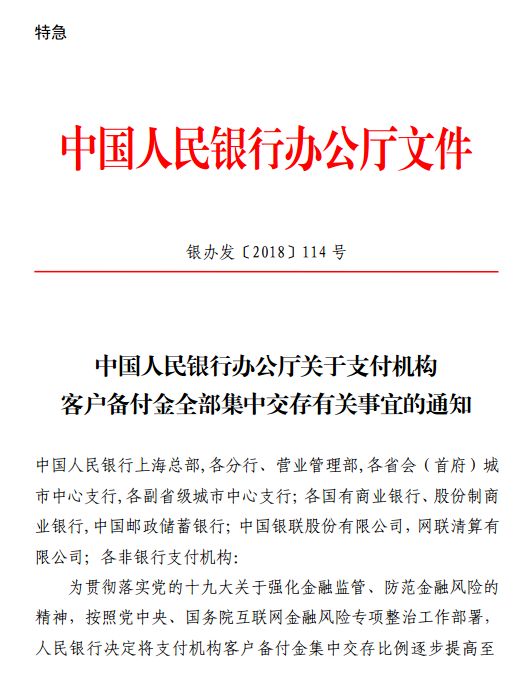 6月29日晚上,央行发布特急通知,宣布将支付机构客户备付金集中交存比例逐步提高至100%。