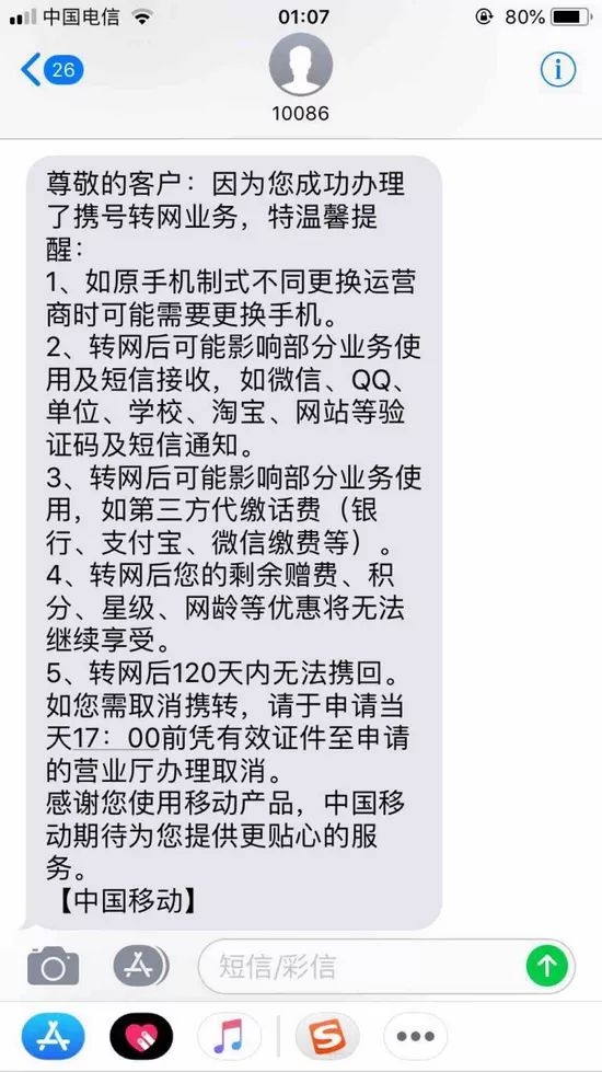 有近日成功携号转网的用户展示的短信显示,确实被“提醒”:转网后可能影响部分业务使用及短信接收,如微信、QQ、单位、学校、淘宝、网站等验证码及短信通知。