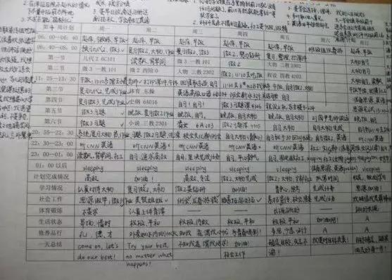 每天6点起床,6:40开始自习,白天除了上课和吃饭,其余大部分时间都用来自习、听英语,直到凌晨1点才上床睡觉,连周末也是如此。