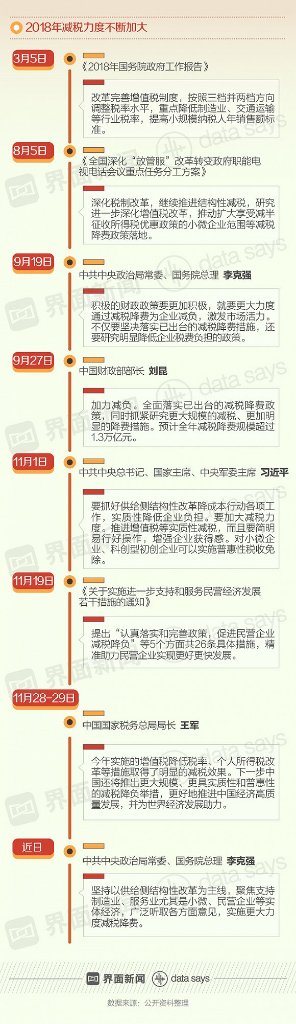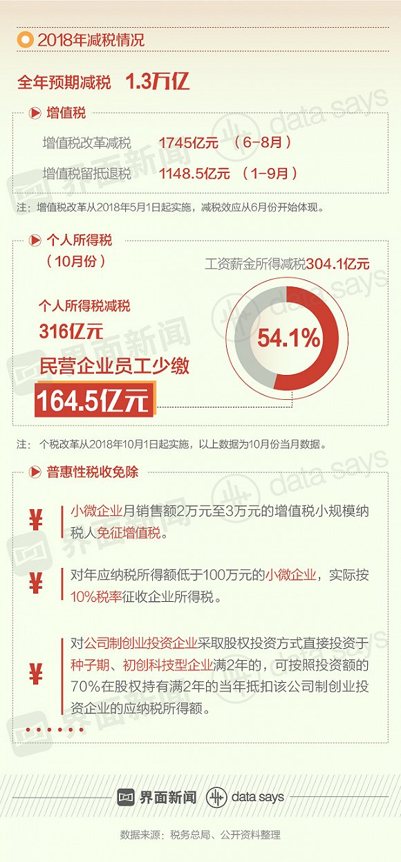 2018年,中国先后实施了增值税和个税改革。税务总局数据显示,2018年全年预期减税1.3万亿元。国家还针对小微企业和初创企业推出了多项普惠性税收免除。