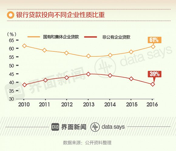 民企的融资一直比较难。银行贷款方面,银行贷款投向非公有企业的比例在2013年后不断下降,如今已经不足四成。