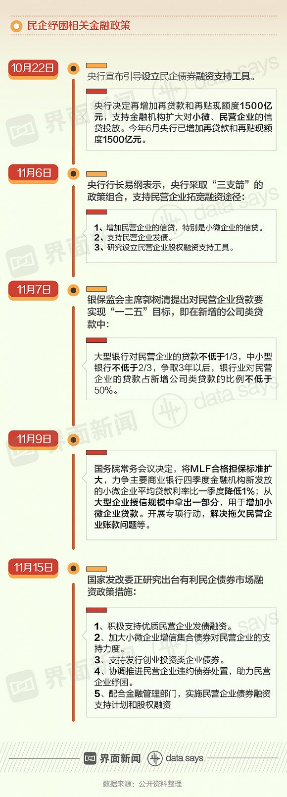 为改善这一状况,2018年10月以来,中国金融部门接连发声要支持民企发展,具体举措包括增加民企信贷投放、降低贷款利率、支持债券融资等。
