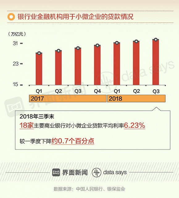 央行数据显示,银行业金融机构用于小微企业的贷款金额不断上涨,2018年第三季度已超33亿元。同时,银行对小微企业的贷款平均利率也在下降。