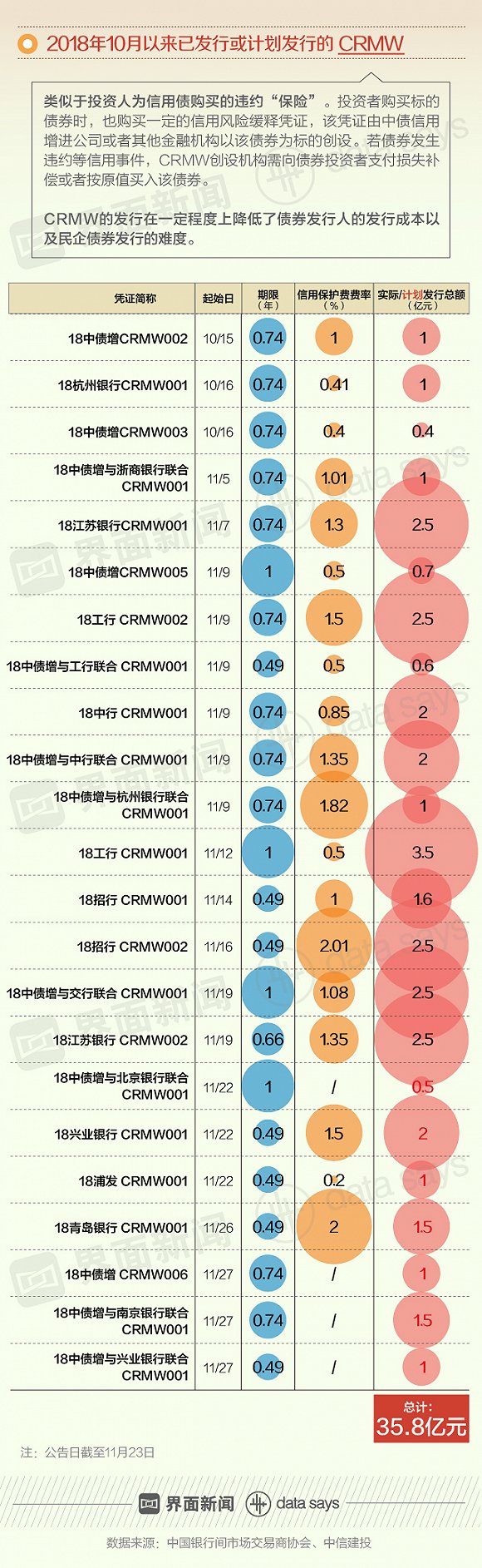 中国银行间市场交易商协会公告显示,2018年10月至11月23日,有23只CRMW凭证已经或计划发行,发行总额近36亿元。
