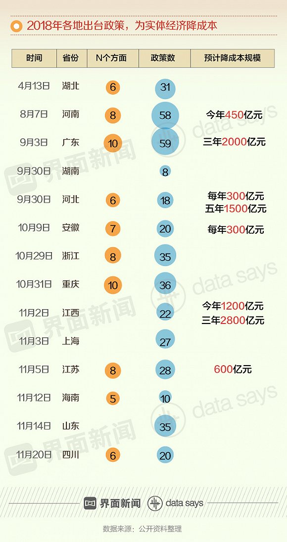 据界面数据(公众号ID:tuli_shuju)不完全统计,2018年以来,已有至少15个省(市区)出台了降成本政策,为实体经济减负。11月以来,各地降成本政策的发布频率明显上升,且都把民企作为重点支持对象。