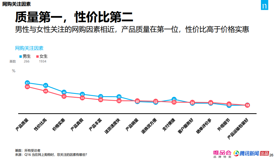 报告显示,无论是一二线城市,还是三四线城市,在消费者关注的购物因素中,质量均排在首位,性价比则稳居第二。且从唯品会平台近三年的数据上可看到,“性价比”一词在商品评价中的占比显著提升。