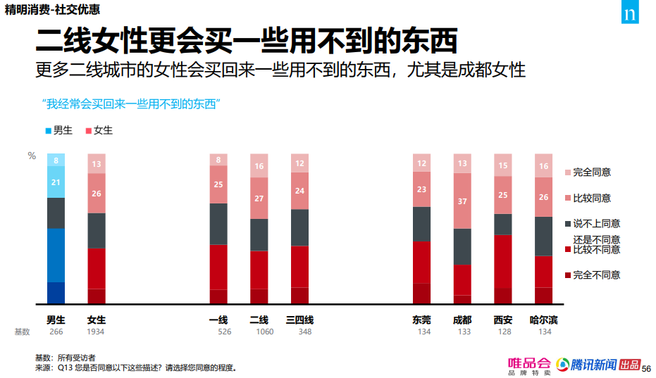 此外,二线城市女性更爱社交优惠,尤其是哈尔滨女性。更多二线城市的女性会买回来一些用不到的东西,尤其是成都女性。