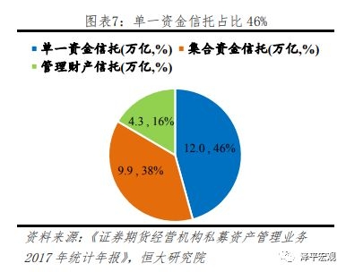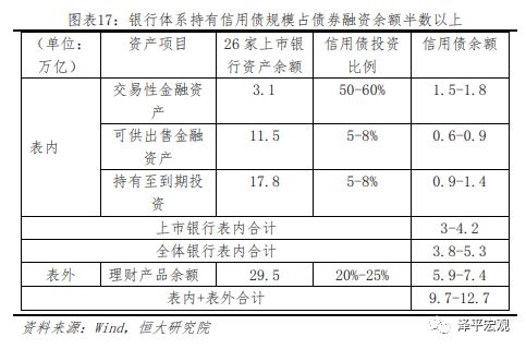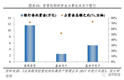 具体从资金来源上来看,除银行贷款外,其他债务融资方式中的资金大多也来自于银行。1)债券主要的持有方是银行,从银行持有的信用债来看,我们测算的表内持有信用债的规模约4-5万亿,表外理财持有的规模约6-7万亿,总量接近10-13万亿,而债券融资余额是18万亿,半数以上资金来源于银行。2)非标融资的资金方大多也是银行,非标资产由各资管计划配置,根据证券基金协会2017统计年报显示,券商资管、基金专户、基金子专户的资金来源中银行委托资金分别占比72%、52%、73%。
