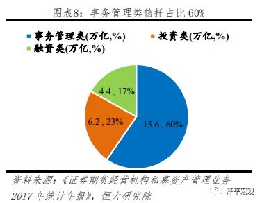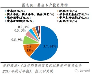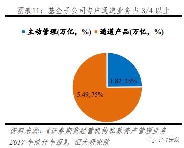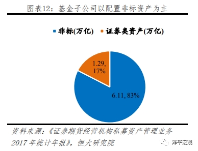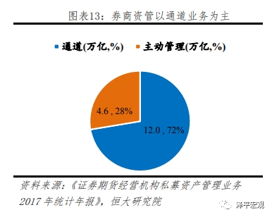 券商资管在标准化资产投资方面有多年的经验,但通道业务带动了其规模快速飙升。在2001年拿到资管牌照后,初期以做标准化资产的投资为主,2012年“一法两则”打开金融自由化闸门后,定向资管投资范围扩展到非标债权,通道业务全面铺开。通道业务费率较低,但易于冲规模,因此带动了券商资管的发展。截至2017年底,券商资管主动管理的规模为4.6万亿,通道业务规模高达12万亿。从投资标的来看,投向交易所、银行间市场的标准化资产规模约6.4万亿,其他投向非标资产的规模约为11.12万亿