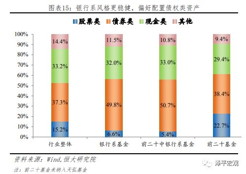 其次,从目前银行系基金公司的发展情况来看,虽然管理规模较大,但投资股票比例明显低于行业平均。银行系基金相比其他基金公司的优势是母银行渠道,借此优势其发展成了公募基金中的重要力量,当前15家银行系基金中,有6家的资产规模在基金公司排名中列于前20(共129家)。而银行系基金明显带有银行的稳健风格,从资产配置结构可以看出,银行系配置股票类资产的比例为6.6%,远低于15.2%的行业平均水平,从发展较好的6家[1]银行系基金(位列前20名)来看,配置股票的比例仍非常低,为5.4%,而前二十的公募基金配置股票类资产的比例大多在20%以上。(注:[1]指建信基金、工银瑞信、中银基金、招商基金、农银汇理、兴业基金)