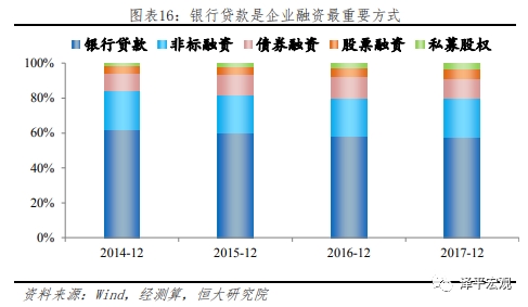 银行是我国融资体系中的支柱,我国融资结构以间接融资、债务融资为主。从我们测算的企业融资的数据来看,银行贷款是我国企业融资最重要的方式,长期以来贷款占比超过60%,非标债权融资为第二大融资来源,截至2017年底,占比超过20%,债券融资占比则维持10%左右,股票及股权融资则合计占比不超过10%。