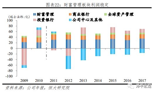 定位聚焦财富管理,提升利润稳定性。巴塞尔协议Ⅲ之后,2011年瑞士出台新资本计提要求,瑞银选择收缩资本消耗高、利润波动大的投行业务,向资本消耗低、盈利水平稳定的财富管理聚焦。此后,财富管理带来的利润明显增加,2011年财富管理贡献31.8亿的税前利润,相比2010年增加10.0亿,截至2017年底,财富管理板块利润为35.03亿,占利润总额的66.5%。