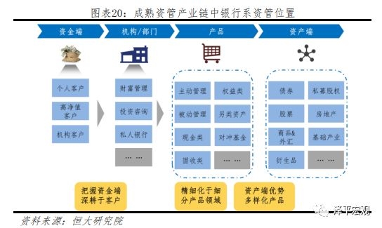 理论表明,在资管产业链靠近上游资金端和下游资产端的附加值相对更大,于任意一端建立优势的机构往往能成为行业巨头,而海外银行系资管领军者均遵循以上规律,形成三类特色资管风格: 1)以财富管理为核心的机构,深耕于客户,与其他业务部门协同,保持竞争优势,以瑞银集团为代表;2)以多样化产品为重点的机构,利用传统信贷业务客户优势向资产管理业务转移,为各类客户提供风险等级阶梯型产品,以摩根大通银行为代表;3)精细化于细分领域的精品型机构,以某一特色投资领域立足于市场,或通过不断的同类并购成为资管市场的巨头。
