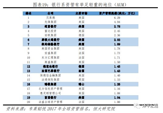 海外资管市场经过多年的竞争,已经形成了从资金端-资产端较为完整的资管产业链,其中银行系资管凭借母行的客户、渠道优势,在资管市场上有举足轻重的地位,根据韦莱韬悦2017年统计数据,AUM(AssetsUnder Management)排名前20的资管机构中,银行系有7家。