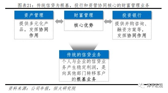 瑞银集团的运作分为三大条线,1)传统的个人与企业的信贷业务是瑞银的根基,以优秀的服务和多元的产品吸引客户,向其他业务条线转移客户,如将高净值客户转移至资产管理、财富管理,将企业客户转移至投资银行。2)资产管理主要做大规模和多元化的全球资产管理,提供包括权益类、固定收益类、对冲基金等另类投资工具;3)投资银行提供并购咨询、风险管理、融资方案等,资产管理和投资银行共同为财富管理提供支持,为财富管理客户提供精细化、全方位的金融服务,增加客户粘性。