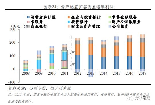 摩根和大通在合并后经历了一段磨合期,早期是六大板块并行,来自大通的零售金融服务、卡服务、商业银行,来自摩根的投资银行、财产与证券服务、资产和财富管理。2012年正式融合成至今沿用的四大业务线,1)消费者和社区银行,向个人和中小企业提供贷款和投资产品和服务;2)企业与投资银行,提供投资银行产品和服务,主要来自于JP Morgan;3)商业银行,向各类机构提供金融服务方案,包括贷款、投资、融资等;4)资产与财富管理,资产管理业务为投资者提供各种资产类别的投资、资产负债管理和风险预算等在内的全球资产配置服务,财富管理业务为客户提供投资建议、税务筹划和专业财富咨询等。
