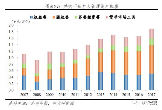 纽约梅隆银行由纽约银行和梅隆金融公司于2007年7月合并而来,是全球最大的资产管理公司之一,纽约梅隆的资管业务发展更多受梅隆公司的影响,梅隆在合并前就收购过5家独立的资管机构。截至2017年底,公司AUM的规模是1.9万亿美元(约折合人民币12.8万亿)。