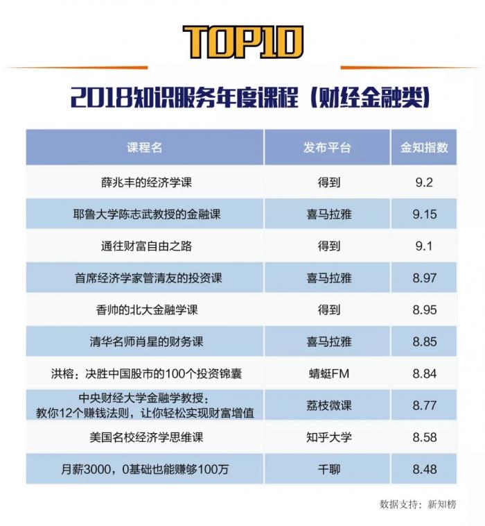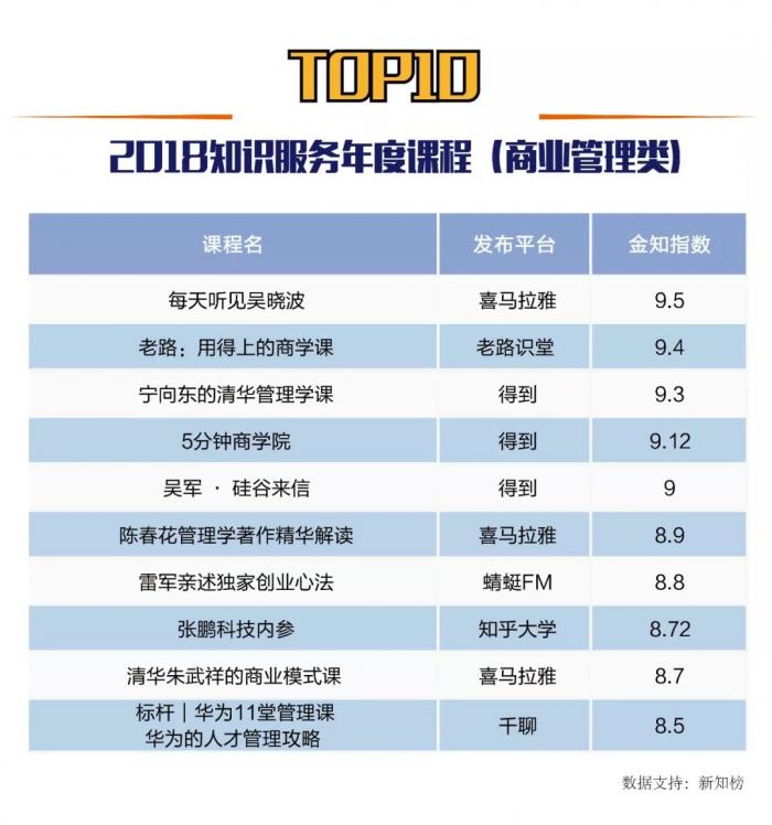 榜单由新知榜提供数据支持,以金知指数为依据,分别评选出2018知识服务年度财经金融类、商业管理类2个领域最值得推荐的10大精品课程。