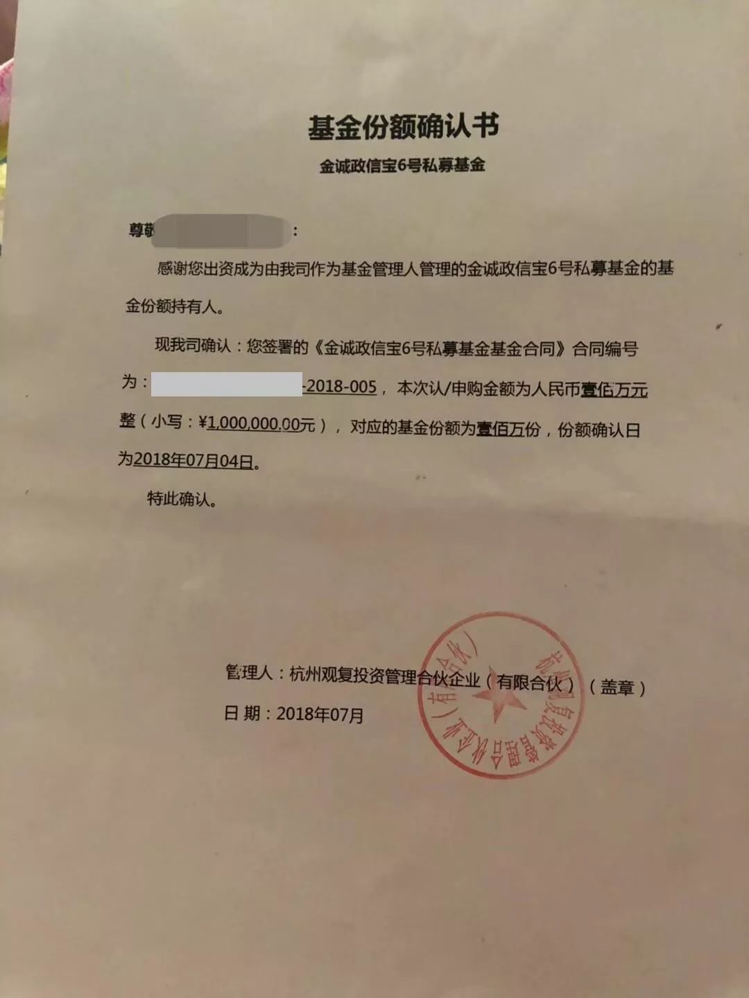 据投资者提供的基金合同,她所购买的私募基金为金诚政信宝6号,成立于2017年5月4日,该基金采用私募契约型基金封闭式运作模式,在基金存续期内,基金份额持有人可以在每月15号约定的开放日进行赎回,募集资金投资于金诚集团旗下的在中国基金业协会备案的私募基金管理人所发行的政信类和PPP类私募基金,中国基金业协会显示,该基金目前仍在运作状态。