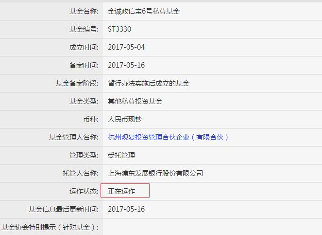 金诚政信宝6号的基金管理人为杭州观复投资管理合伙企业(有限合伙),根据天眼查数据,向上穿透后指向金诚集团,也就是说杭州观复是金诚集团控股下属机构。