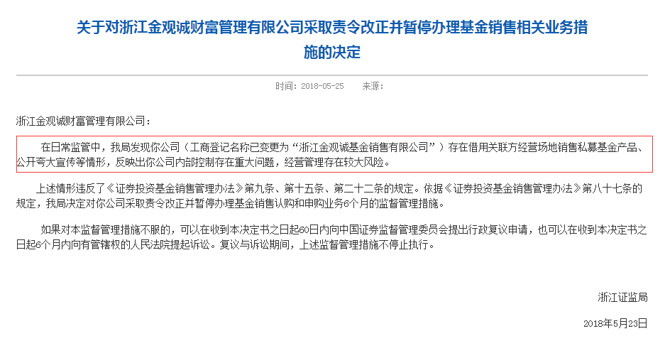 对于王微指控的金诚禁销后依然违规展业的说法,金诚集团并不认同,金诚集团方面认为,“证监局并未对金诚集团旗下基金管理人进行行政监管措施,也就是说,在6月底基金管理人自行募集发行的基金产品,是完全没有违背浙江证监局对浙江金观诚基金销售有限公司开出的行政监管措施的。”
