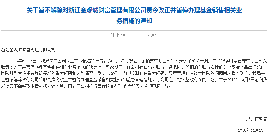 6个月业务冻结期已过,金诚集团依旧没能等来“解冻书”,11月23日,浙江证监局认为,整改期间,浙江金观诚基金销售有限公司存在“关联方业务混同”、“代销的关联方发行的多个基金产品出现兑付风险”等重大问题,对此暂不解除停办业务,业务接连被监管“冻结”在行业内尚属罕见,对金诚集团来说无疑是雪上加霜。