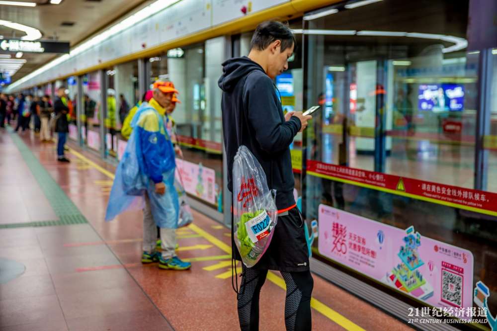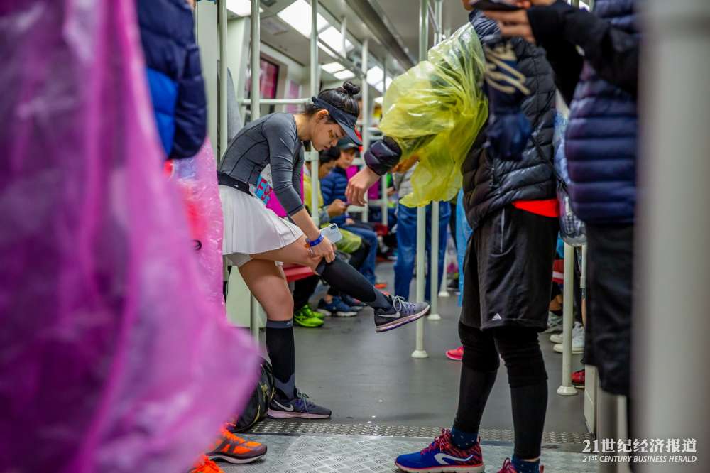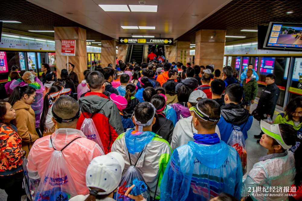 (甘俊/广州报道)2018广州马拉松赛9日鸣枪开跑,比赛路线基本沿用“一江两岸”的路线设置,起点设在天河体育中心南广场,马拉松的终点设在花城广场,半程马拉松的终点在广交会展馆。图为广州地铁为了配合马拉松赛事,将首班车时间提早至5:30发车。
