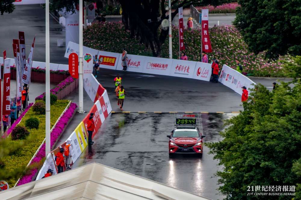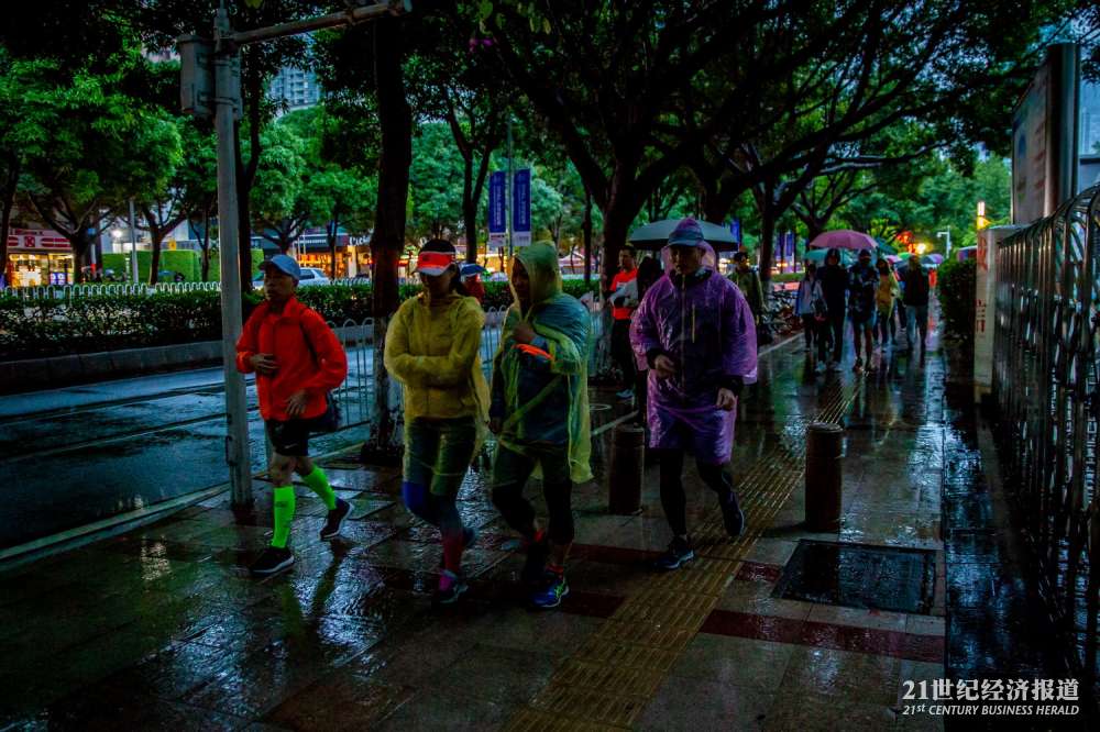 比赛前天色渐渐亮起,但雨势仍未减弱选手只能穿雨衣慢速步行至起跑点。