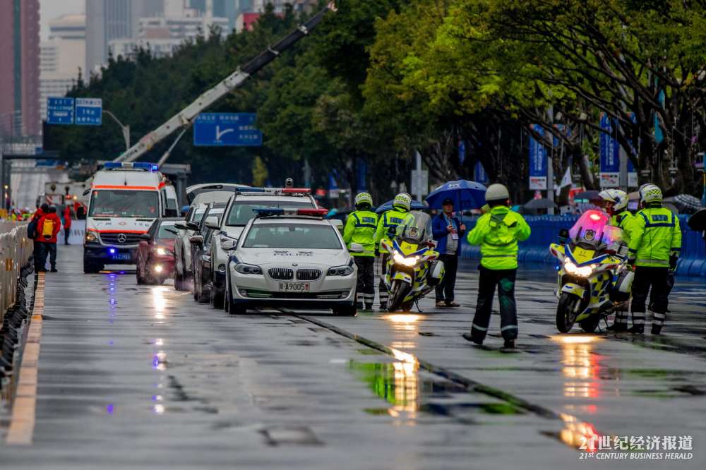 开路车辆由两辆警用摩托、两辆警车、两辆媒体车组成,队伍末端还有两辆救护车垫后。