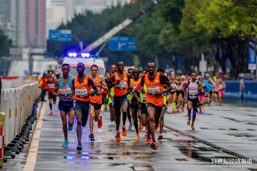 男子冠军竞争十分激烈,两位选手几乎是同时到达终点。最终身着橙色衣服的摩洛哥选手穆罕默德•齐亚尼领先一步,获得2018广州马拉松的冠军,成绩约2小时10分45秒,第二名成绩约为2小时10分46秒。
