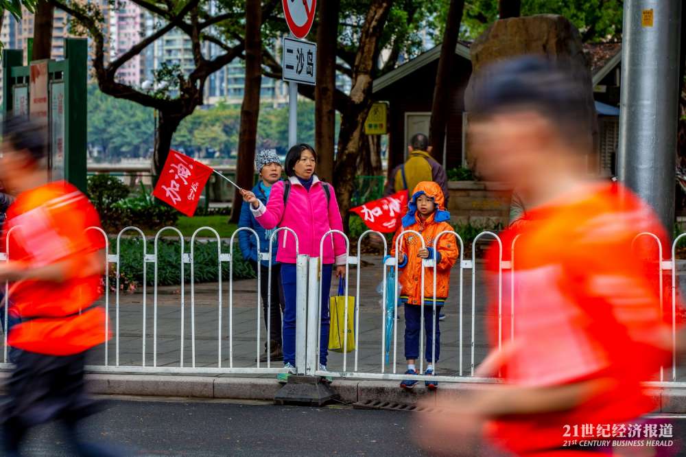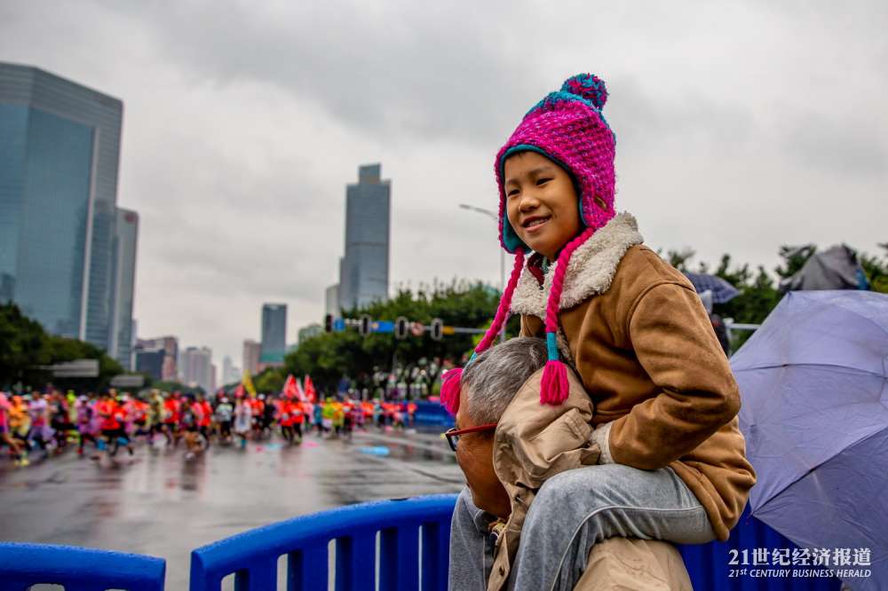 赛道有栅栏挡着,爷爷举高孙女让她有更好的视野。