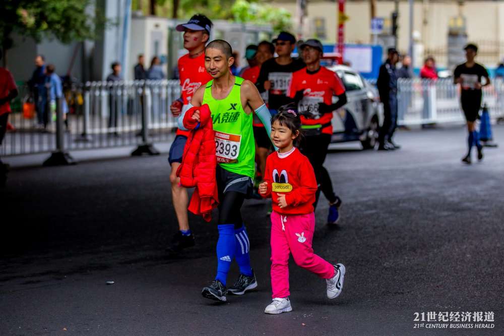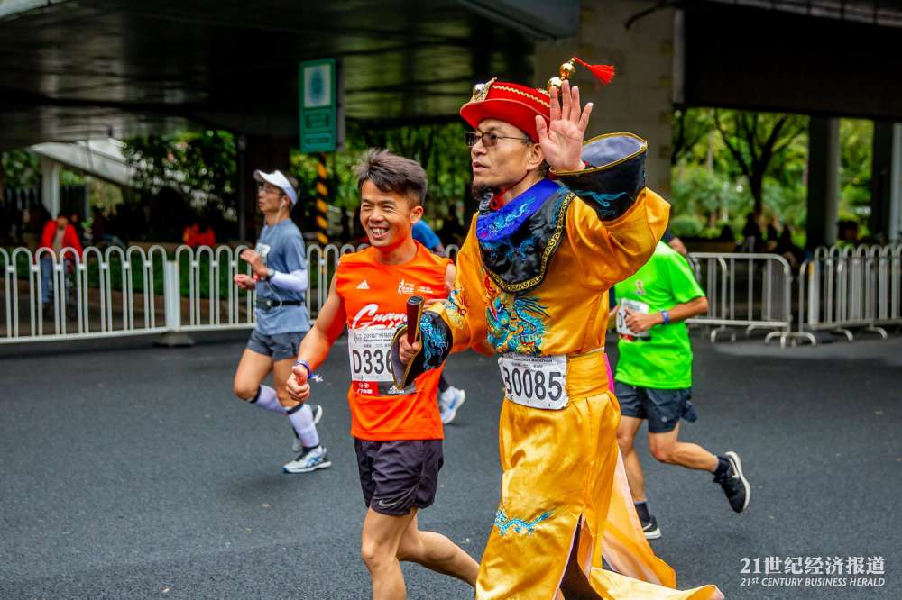 打扮成八路军模样的跑手,令人钦佩的是尽管天气下雨,本人在赛事中后阶段的赛道上看到他仍然举着被雨水打湿的国旗。