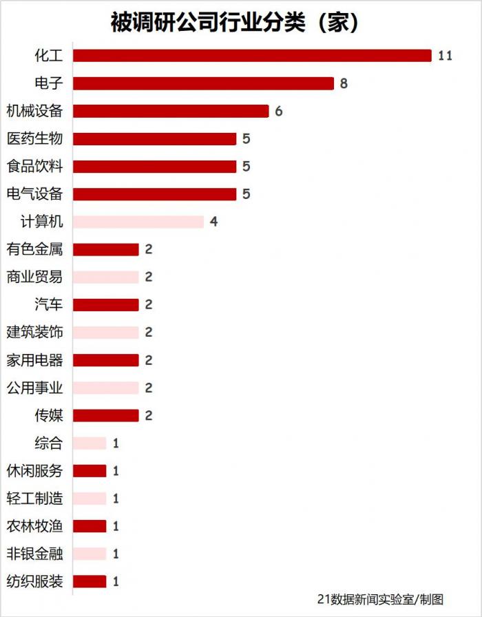 从行业分布来看,本周化工行业最受青睐。青松股份、当升科技、红宝丽、多氟多等11家公司获调研。其次是电子和机械设备行业,分别有8家和6家公司被调研。