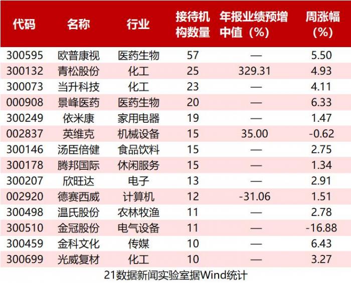 接待机构数量方面,欧普康视成为最受机构青睐的公司,共计接待了57家机构,包括景林资产、清水源投资等知名私募。